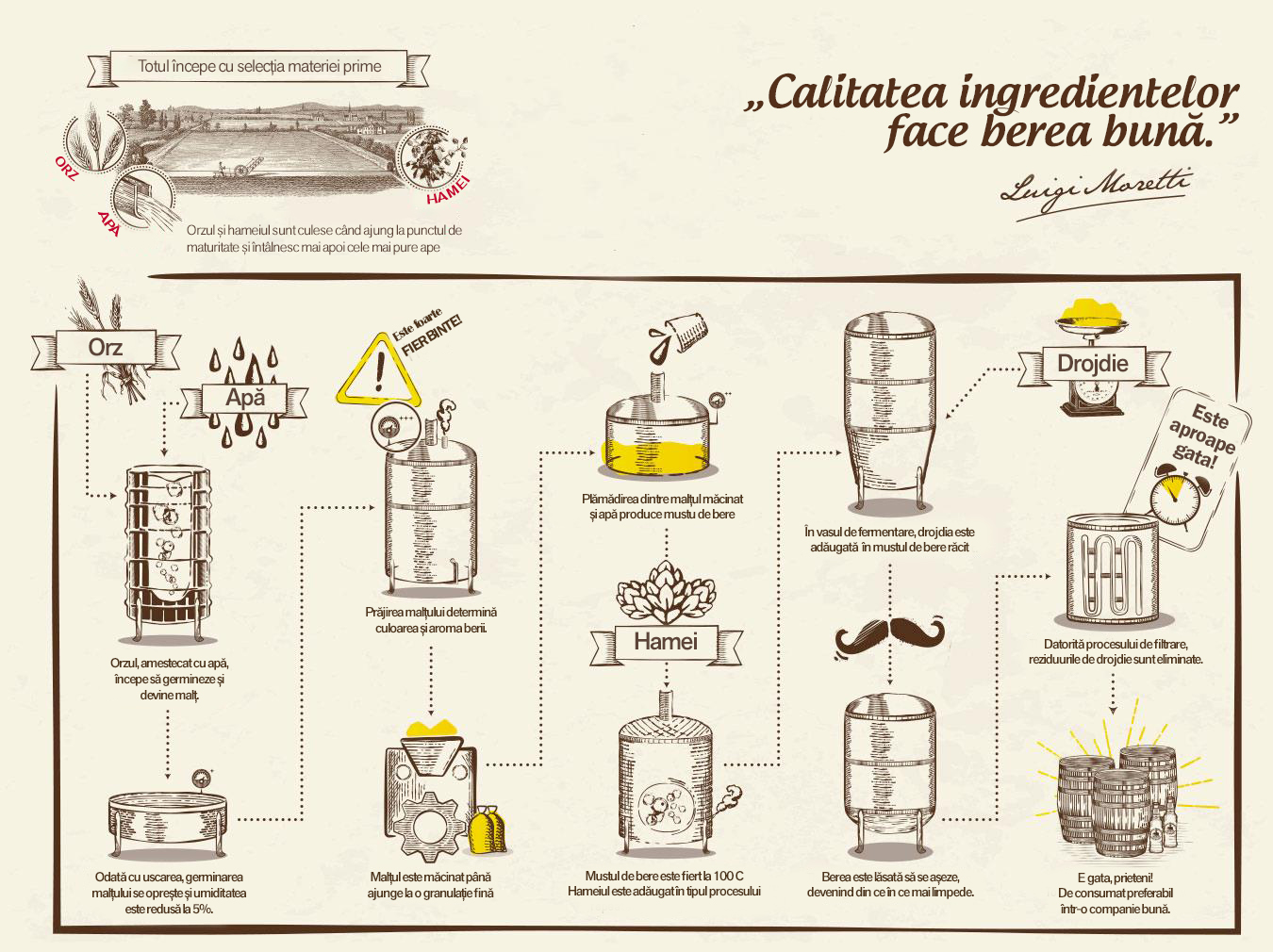 Birra Moretti este o bere de calitate, făcută într-un mod tradițional. Este rezultatul unui proces de producție care a rămas aproape neschimbat, din 1859.